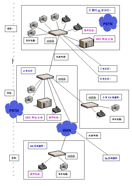 在銀行的省、市級分行分別部署一臺NBX網(wǎng)絡(luò)交換機——只需通過接入銀行系統(tǒng)內(nèi)部局域網(wǎng),經(jīng)過簡單的配置即可使用。然后根據(jù)需要,在市內(nèi)各個儲蓄所、各縣級儲蓄所配置相應(yīng)數(shù)量的數(shù)字話機,那么在全省內(nèi)各個縣市區(qū)的各個營業(yè)網(wǎng)點之間,上下級之間就都可以使用數(shù)字電話機通過數(shù)據(jù)網(wǎng)免費撥打語音電話。