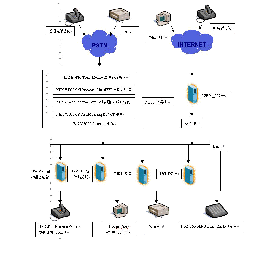 北京晨報(bào)的客戶服務(wù)中心項(xiàng)目是一個(gè)集呼叫中心與辦公系統(tǒng)于一體的語(yǔ)音、數(shù)據(jù)服務(wù)平臺(tái)。通過一條E1中繼線與外部電話網(wǎng)相聯(lián)。內(nèi)部使用50部數(shù)字電話進(jìn)行處理辦公業(yè)務(wù),10個(gè)呼叫中心坐席采用計(jì)算機(jī)的軟電話(pcXset)實(shí)現(xiàn)與客戶的交談,傳真服務(wù)器通過NBX所提供的8條模擬內(nèi)線與外界互通。
