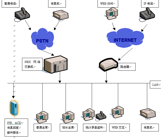基于NBX 網(wǎng)絡交換機的呼叫中心對外部有PSTN和IP兩種接口,可以接入各種類型用戶:普通電話用戶、傳真用戶、WEB訪問用戶、IP電話用戶。NBX呼叫中心通過NBX網(wǎng)絡交換機將外部的PSTN信號轉(zhuǎn)換為以太網(wǎng)數(shù)據(jù)包信號,在呼叫中心內(nèi)部通過局域網(wǎng)提供話音與數(shù)據(jù)服務的集成,從而即以開放的局域網(wǎng)包交換技術實現(xiàn)專用 PBX的話音服務功能并與現(xiàn)有局域網(wǎng)無縫集成,從而實現(xiàn)包括E-mail、傳真、聊天工具、視頻以及話音在內(nèi)的由多種通信媒介的交互。NBX呼叫中心通過統(tǒng)一的ACD將各種通訊方式的訪問協(xié)調(diào)分配,最終實現(xiàn)了呼叫的中心運營和諧與高效。
