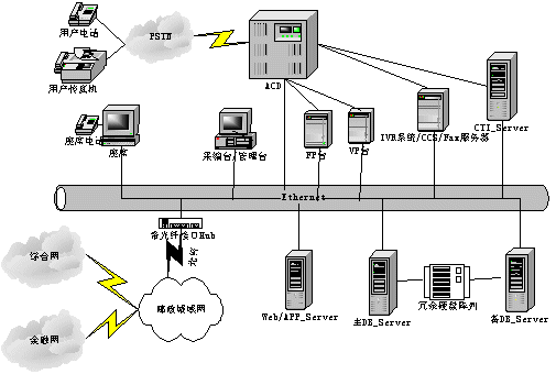 呼叫中心的功能主要有兩方面,一是與用戶進(jìn)行交互,另外與金融主機(jī)房進(jìn)行數(shù)據(jù)交互。呼叫中心系統(tǒng)由兩部分組成:聲訊平臺(CALL CENTER)和業(yè)務(wù)數(shù)據(jù)計算機(jī)網(wǎng)絡(luò)平臺。聲訊平臺由話務(wù)接入設(shè)備(ACD)、IVR系統(tǒng)和CTI服務(wù)器組成,主要負(fù)責(zé)語音資源的管理、呼入話務(wù)的排隊、自動業(yè)務(wù)以及人工座席的管理等;業(yè)務(wù)數(shù)據(jù)計算機(jī)網(wǎng)絡(luò)平臺是對業(yè)務(wù)數(shù)據(jù)的收集、使用、管理、分析等。平臺間通過CTI技術(shù)實(shí)現(xiàn)數(shù)字?jǐn)?shù)據(jù)和語音數(shù)據(jù)的相互轉(zhuǎn)換和同步轉(zhuǎn)移。系統(tǒng)結(jié)構(gòu)如下。