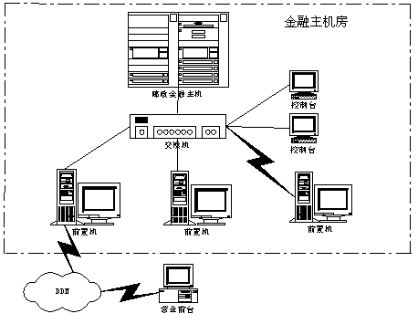 郵政儲蓄金融主機(jī)房主要包含金融主機(jī)、前置機(jī)及網(wǎng)絡(luò)通信設(shè)施。其結(jié)構(gòu)示意圖如下。
