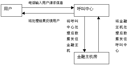 用戶通過撥打電話185連接到185客戶服務(wù)中 心,然后根據(jù)客戶服務(wù)中心的提示信息利用電話按鍵或語音輸入用戶的請求信息。用戶的請求信息傳送到呼叫中心后,呼叫中心會根據(jù)用戶的請求信息內(nèi)容進(jìn)行處理,如查詢儲蓄法規(guī)等,然后將處理結(jié)果反饋給用戶,如果牽涉到用戶的帳戶數(shù)據(jù),則呼叫中心將用戶的請求首先進(jìn)行處理,然后將處理后的信息發(fā)送給金融主機(jī)房,由金融主機(jī)根據(jù)呼叫中心傳來的數(shù)據(jù)進(jìn)行帳務(wù)處理,然后將處理結(jié)果返回給呼叫中心,呼叫中心再對金融主機(jī)房返回的數(shù)據(jù)進(jìn)行處理成客戶能夠聽到的語音信息,將處理結(jié)果傳給用戶。上述流程是一個單個處理流程,實(shí)際上跟用戶進(jìn)行交互時,一項(xiàng)業(yè)務(wù)會有多個往返的處理流程。