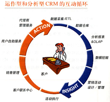 運作型CRM和分析型CRM不是孤立的模塊,他們之間是互動的,首尾相接關(guān)系。分析型CRM從客戶背景資料和消費數(shù)據(jù)經(jīng)過數(shù)據(jù)采集、數(shù)據(jù)倉庫、數(shù)據(jù)挖掘和分析而得出分析的結(jié)論。這些結(jié)論又被制定成為市場活動被運營型CRM通過客戶聯(lián)系中心、銷售管理、大客戶管理等模塊進行執(zhí)行。執(zhí)行的結(jié)果和反饋又重新被分析系統(tǒng)進行分析和評價形成一個循環(huán)過程。 亞信科技(中國)有限公司 地 址:北京海淀區(qū)中關(guān)村南大街6號中電信息大廈三、四層 |