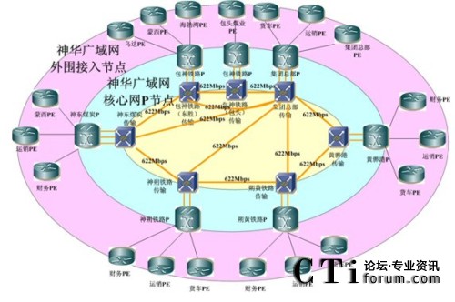 據(jù)神華集團(tuán)信息管理部廣域網(wǎng)項(xiàng)目負(fù)責(zé)人說(shuō):“該項(xiàng)目建成后將是一個(gè)建設(shè)在高速傳輸網(wǎng)平臺(tái)之上,并利用其提供的線路構(gòu)成廣域網(wǎng)核心節(jié)點(diǎn)之間的互聯(lián)線路,網(wǎng)絡(luò)拓?fù)湓?個(gè)核心節(jié)點(diǎn)和以北京節(jié)點(diǎn)為中心直連7個(gè)核心節(jié)點(diǎn)的放射型622M環(huán)形+放射混合性企業(yè)頂級(jí)骨干廣域數(shù)據(jù)網(wǎng)絡(luò)結(jié)構(gòu)。該網(wǎng)絡(luò)結(jié)構(gòu)可避免任一段光纜中斷造成某節(jié)點(diǎn)直連線路和環(huán)線同時(shí)中斷的可能性,即對(duì)網(wǎng)絡(luò)單點(diǎn)故障實(shí)現(xiàn)環(huán)路保護(hù)。同時(shí),網(wǎng)絡(luò)中斷到恢復(fù)的周期大大縮短:傳輸系統(tǒng)中SDH的環(huán)路自愈從中斷到恢復(fù)周期為50ms,網(wǎng)絡(luò)節(jié)點(diǎn)之間通過(guò)IGP的路由收斂,從中斷到恢復(fù)的周期約為200ms!