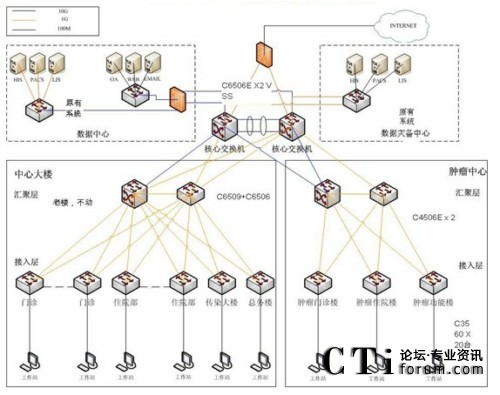 4506E作為新腫瘤大樓的匯聚層和整個醫(yī)院的小災備中心,并上連至核心交換機以節(jié)約投資成本,而接入層繼續(xù)采用思科Catalyst 3560交換機,既方便了管理,也為日后無線網絡的部署作好了準備。(網絡拓撲圖如下)