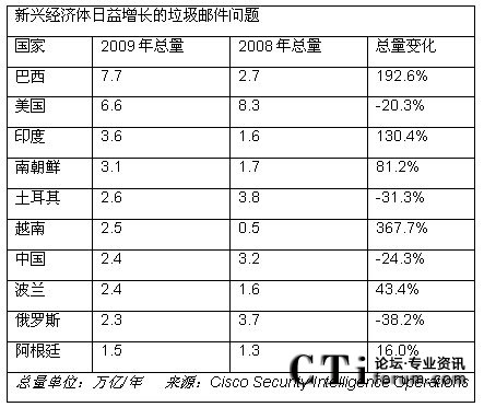 幾個(gè)世界經(jīng)濟(jì)領(lǐng)先的國家在2008年和2009年間垃圾郵件量有所降低;然而,發(fā)展中國家的垃圾郵件量呈現(xiàn)上升趨勢(shì)。