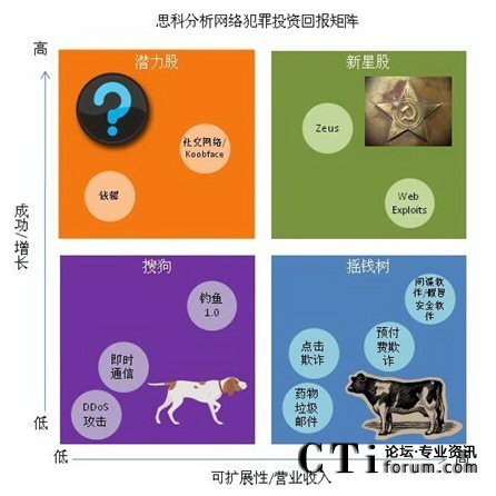 思科網(wǎng)絡(luò)犯罪投資回報(bào)(CROI)矩陣:今年的《年度安全報(bào)告》首次推出了思科CROI矩陣,以波士頓咨詢集團(tuán)著名的“增長(zhǎng)-份額矩陣”為基礎(chǔ)。CROI分析了2010年何種類型的網(wǎng)絡(luò)犯罪將為成為“成功者”以及“失敗者”。該矩陣根據(jù)2009年的表現(xiàn),預(yù)測(cè)大量的銀行業(yè)Trojan