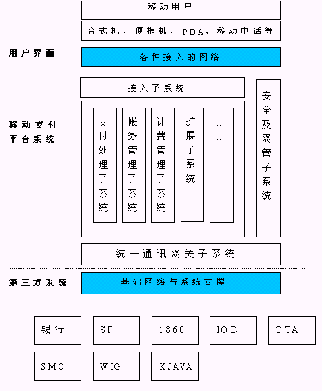 3、 移動支付平臺可以支持多種支付方式,如信用卡、儲值卡、小額支付等;平臺本身具備一小額儲值卡平臺,用于移動業(yè)務和ICP業(yè)務支付等;