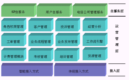 SP統(tǒng)一管理系統(tǒng)從功能邏輯上劃分,我們歸納為三大功能層來對(duì)系統(tǒng)進(jìn)行總體的介紹:接入層、運(yùn)營(yíng)管理層、自服務(wù)層。如下圖所示: