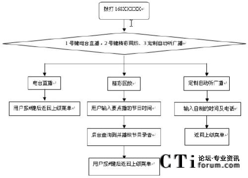 用戶使用時(shí)可通過(guò)固定話機(jī)、小靈通或手機(jī)撥叫業(yè)務(wù)特號(hào)進(jìn)入系統(tǒng),根據(jù)系統(tǒng)的語(yǔ)音提示按鍵選擇收聽(tīng)不同的電臺(tái)節(jié)目,在收聽(tīng)廣播的過(guò)程中,可按下電話機(jī)上的#字鍵返回上級(jí)菜單提示音,以滿足用戶在收音過(guò)程中需要不斷調(diào)換頻道的要求。