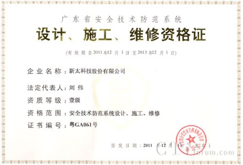 CTI論壇(ctiforum)12月21日消息(記者 張潔):2011年12月,新太科技再傳喜訊,公司順利通過(guò)廣東省公安廳認(rèn)定的“廣東省安全技術(shù)防范系統(tǒng)設(shè)計(jì)、施工、維修一級(jí)資格證”換證審核,成功獲得新證書。