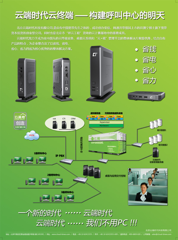 云端時代是由有中國寬帶先生之稱的,成功創(chuàng)辦亞信、網(wǎng)通并帶領其上市的田溯寧博士旗下寬帶資本投資的創(chuàng)業(yè)型公司。同時也是北京市“祥云工程”計劃資助的云計算基地中的重要成員。 云端時代致力于成為業(yè)內領先的云終端設備、桌面云系統(tǒng)和“云+端”管理平臺的整體解決方案提供商,幫助中國企業(yè)向 “云+端”架構轉型。 云端時代的管理團隊由具有國際化背景和本地化經(jīng)驗的優(yōu)秀人才構成,核心成員來自國內外知名的瘦客戶機設備廠商、嵌入式芯片廠商、集成電路企業(yè)以及通訊企業(yè)等。如:AMD、聯(lián)想、威盛、升騰、Wyse、控創(chuàng)等等。