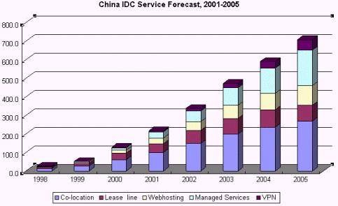 Frost & Sullivan研究表明,在2000年,中國IDC市場規(guī)模約為1億2千萬美圓,預(yù)測到2005年,將達(dá)到7億美圓。從2000年到2005年間,中國IDC市場的年平均復(fù)合增長率將達(dá)42.3% 。