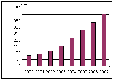 表1表明了2000年至2007年亞太新一代移動(dòng)網(wǎng)絡(luò)市場的收入與增長率。