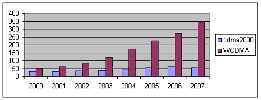 2000年,3G市場收入在cdma2000(大約31億美元,占38%)與WCDMA(大約50億美元,占62%)分布為1/3比2/3。我們不難看出,這種變化有利于WCDMA。到2007年,預(yù)計(jì)WCDMA將占全部市場收入的86%。這是由于對于WCDMA,運(yùn)營商需要增加支出來將其網(wǎng)絡(luò)升級(jí)為GPRS、EDGE與WCDMA。同時(shí),在預(yù)測期內(nèi),TDMA運(yùn)營商最終要將其所有現(xiàn)存的TDMA與模擬特性升級(jí)為GSM/GPRS。相比之下,CDMA運(yùn)營商處于良好的狀態(tài),其現(xiàn)有基礎(chǔ)設(shè)施的大部分軟件已經(jīng)升級(jí)。CDMA運(yùn)營商,如Verizon,確實(shí)也有模擬特性,但是較之GSM/TDMA而言,它們要低得多。CDMA運(yùn)營商支出的大部分將以新的Cell sites的形式出現(xiàn)的覆蓋率。