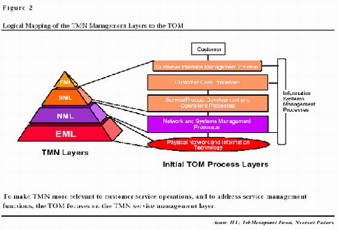 國(guó)際電聯(lián)的出發(fā)點(diǎn)雖好,但它更強(qiáng)調(diào)從網(wǎng)絡(luò)元素層開始的清晰的統(tǒng)一體系,而為了保護(hù)自己的商業(yè)秘密,各大運(yùn)營(yíng)商往往不希望公開自己的網(wǎng)絡(luò)元素層的標(biāo)準(zhǔn),同時(shí),網(wǎng)絡(luò)元素層的標(biāo)準(zhǔn)化對(duì)運(yùn)營(yíng)商的業(yè)務(wù)發(fā)展幫助不大。在熱烈討論了一段時(shí)間之后,TMN漸漸被忽視了。而另一只希望從技術(shù)角度解決管理問(wèn)題的力量,電信管理論壇,卻帶有一定偶然性地逐漸確立了自己的地位。電信管理論壇在開始的時(shí)候并沒(méi)有夢(mèng)想能建立覆蓋整個(gè)電信運(yùn)營(yíng)企業(yè)的管理系統(tǒng),其初衷是解決在當(dāng)時(shí)日漸突出的跨企業(yè)的客戶數(shù)據(jù)交換問(wèn)題。因此,和國(guó)際電聯(lián)不同,電信管理論壇從開始就非常強(qiáng)調(diào)實(shí)用性,并把目光集中到了各企業(yè)相互間有大量數(shù)據(jù)交換,因此迫切需要建立標(biāo)準(zhǔn)的服務(wù)管理層和網(wǎng)絡(luò)管理層,并提出了電信運(yùn)營(yíng)支持系統(tǒng)(OSS)的概念,并公布了模塊化的電信運(yùn)營(yíng)導(dǎo)圖(TOM)。
