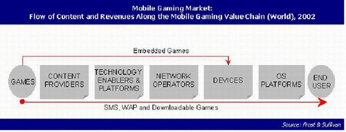 如果市場(chǎng)潛力足夠大,那么選擇適當(dāng)?shù)臉I(yè)務(wù)模式就是實(shí)現(xiàn)市場(chǎng)潛力的保證。而業(yè)務(wù)模式的選擇是與業(yè)務(wù)的市場(chǎng)價(jià)值鏈分不開的。在一些市場(chǎng)價(jià)值鏈較復(fù)雜的應(yīng)用中,業(yè)務(wù)模式的選擇尤為重要,例如,下圖所示的移動(dòng)游戲的價(jià)值鏈就是較復(fù)雜的一個(gè):