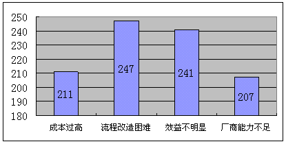 b)流程改造困難,對(duì)這個(gè)困難的擔(dān)心的企業(yè)數(shù)量最多,考慮到國(guó)內(nèi)企業(yè)的現(xiàn)實(shí)管理問(wèn)題,流程改造必然與現(xiàn)實(shí)的利益發(fā)生矛盾,引起的阻力不可輕視。