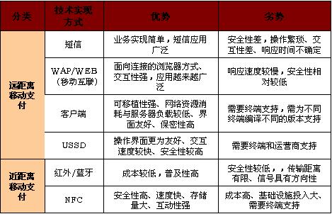 移動(dòng)支付(Mobile payment)包括遠(yuǎn)距離方式和近距離方式。遠(yuǎn)距離移動(dòng)支付的主要技術(shù)實(shí)現(xiàn)方式有SMS、WAP、客戶端(手機(jī)軟件)和USSD;近距離移動(dòng)支付的主要技術(shù)實(shí)現(xiàn)方式有紅外和NFC。各種移動(dòng)支付業(yè)務(wù)技術(shù)實(shí)現(xiàn)方式優(yōu)劣勢(shì)比較詳見(jiàn)圖表1。