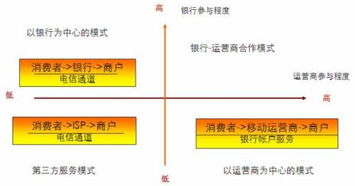 從產(chǎn)業(yè)鏈環(huán)節(jié)上看,移動(dòng)支付的主要參與者主要包括:消費(fèi)者、平臺(tái)提供商、銀行、運(yùn)營(yíng)商和商戶。其中,銀行和運(yùn)營(yíng)商在其中具有較高的談判能力。因此,可以按照這兩者在產(chǎn)業(yè)鏈中的參與程度,劃分移動(dòng)支付的商業(yè)模式?偟膩(lái)說(shuō),銀行機(jī)構(gòu)管理著廣大用戶的資金帳戶,擁有完善的支付體系,在支付領(lǐng)域具有天然的用戶信任。運(yùn)營(yíng)商則擁有完備的網(wǎng)絡(luò)設(shè)施和先進(jìn)的IT系統(tǒng),通過(guò)定制終端,運(yùn)營(yíng)商可以將各種先進(jìn)的移動(dòng)應(yīng)用提供給用戶,使用戶獲得良好的移動(dòng)化生活體驗(yàn)。因此,運(yùn)營(yíng)商在這方面具有較好的用戶資源和營(yíng)銷渠道。