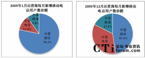 考查三大運(yùn)營(yíng)商2009年的每月新增用戶數(shù)份額:中國(guó)移動(dòng)每月新增用戶數(shù)份額從1月的78.2%下降到12月的47.6%,顯然,中國(guó)移動(dòng)每月用戶增速逐漸放緩,而中國(guó)電信和中國(guó)聯(lián)通的每月新增用戶數(shù)份額呈增長(zhǎng)趨勢(shì)。
