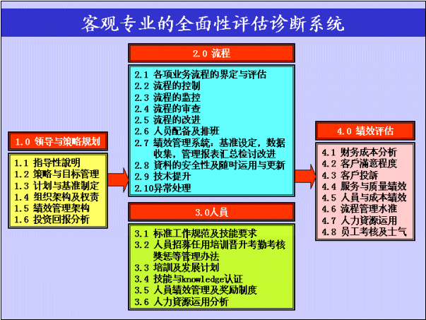 此評估診斷系統(tǒng)以1.0領(lǐng)導(dǎo)與決策規(guī)劃為起始點,作為建立一個以客戶為核心的高質(zhì)量客戶服務(wù)中心的推動根源,并且制定了一個良好的4.0績效評估系統(tǒng),以確保經(jīng)營目標與標準質(zhì)量基準能確實達成,此過程需透過嚴謹?shù)牧鞒淘O(shè)計和高效的人員管理去執(zhí)行這套運營體系。
