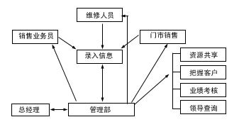 根據(jù)英普的業(yè)務(wù)管理模式,公司將門(mén)市銷(xiāo)售、維修部、大客戶(hù)部的業(yè)務(wù)管理工作,交由管理部全部管理和協(xié)調(diào),這三個(gè)部門(mén)將各自與客戶(hù)接待、交往過(guò)程、工作計(jì)劃全部明細(xì)記錄,交由管理部確認(rèn),管理部在保證必要保密的情況下,進(jìn)行工作再分配,同時(shí)加強(qiáng)業(yè)務(wù)考核和其他管理職能工作。其業(yè)務(wù)流程如圖1。