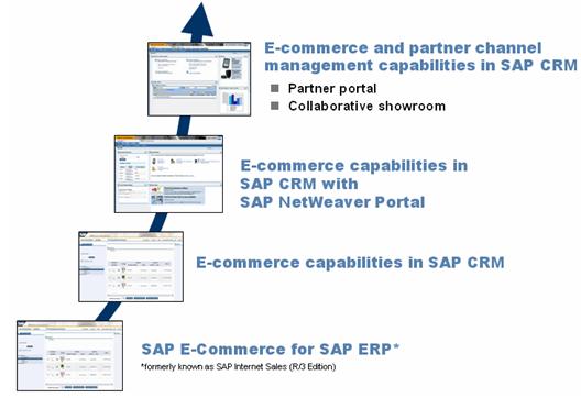 從上圖中,我們可以清楚地看出SAP的電子商務(wù)(E-Commerce)功能經(jīng)歷了一個(gè)不斷進(jìn)化的過(guò)程。主要分成以下四個(gè)階段: