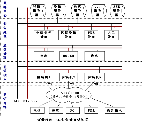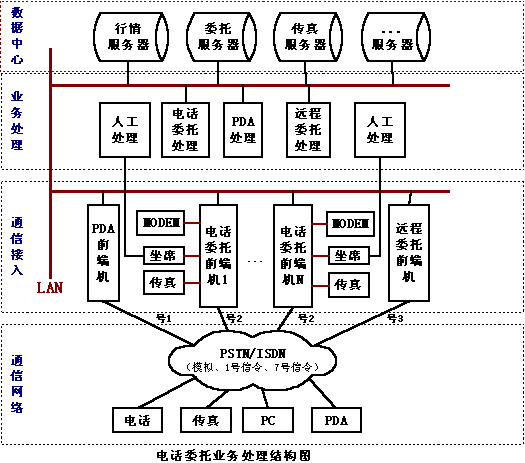 另一種方案是PDA和證券營業(yè)部前端機(實際就是電話委托前端機)采用FSK通訊方式,使用電話委托的通道來完成所有的委托查詢。這種方式的速度快,信息容量大,保密性強,而且營業(yè)部不需單獨申請電話線路,PDA和電話委托線路可動態(tài)分配,使其電話線路得到最大限度的利用。另外,營業(yè)部對外形象也好,只用一個號碼就可讓股民完成電話委托、PDA委托等多種委托方式,給股民帶來了方便。不過這種方式需要得到電話語音卡提供廠商的產(chǎn)品技術(shù)支持,語音卡必須同時支持標(biāo)準(zhǔn)的DTMF和FSK的方式,卡上有充足的能力來處理兩種方式,在語音處理卡的底層驅(qū)動應(yīng)該將電話和PDA的委托區(qū)別開來,目前市場能夠完全支持這種應(yīng)用的只有深圳市東進通訊技術(shù)股份有限公司的產(chǎn)品,東進技術(shù)的新一代PCI系列語音卡數(shù)字卡和模擬卡都完全采用DSP(數(shù)字信號處理器)架構(gòu),卡上有專用DSP來處理DTMF和FSK的收發(fā),是目前PDA委托前端的最好選擇;這種方案還應(yīng)該得到證券電話委托系統(tǒng)的開發(fā)商的支持,在電話委托系統(tǒng)里增加處理PDA委托的功能。目前恒基偉業(yè)的“股靈通”就是采用這種方式。