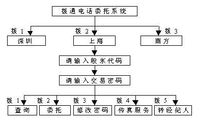 通過該項(xiàng)服務(wù),股民可以在任何地點(diǎn)使用任何一部雙音頻電話方便的向證券公司發(fā)出買入、賣出等各種委托指令,也可以發(fā)出查詢指令,證券公司的電話委托交易系統(tǒng)根據(jù)股民的指令自動(dòng)完成委托及查詢操作,將結(jié)果反饋給股民。股民發(fā)給證券公司的信息,主要為數(shù)碼、數(shù)字,通過雙音頻電話按鍵來傳送。證券公司電話委托交易系統(tǒng)發(fā)給股民的信息,則是用語音傳送的操作及查詢結(jié)果。通過功能擴(kuò)充,還可提供其它配套服務(wù),如將查詢結(jié)果發(fā)送至股民的傳真機(jī)。若股民利用計(jì)算機(jī)接至委托公司,還可享受可視委托等更為多樣的服務(wù)。