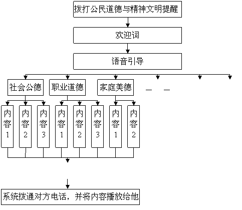 例如,某位公民對(duì)他(她)的鄰居或者同事一些不文明的行為(如深夜打麻將,亂倒垃圾,不講衛(wèi)生,破壞公物……)感到有必要進(jìn)行善意的提醒,但是,又覺(jué)得直接對(duì)他(她)說(shuō)不合適,因?yàn)楫吘闺p方很熟悉或者還要共事,如果直接對(duì)對(duì)方進(jìn)行批評(píng)可能會(huì)引起對(duì)方的反感,即使對(duì)方認(rèn)為自己做的不對(duì),也會(huì)感到很尷尬,很失面子,在這種情況下,這為公民可以撥打“社區(qū)道德與精神文明提醒熱線”,選取熱線內(nèi)預(yù)先已經(jīng)錄制好,經(jīng)過(guò)審定的錄音內(nèi)容,選取內(nèi)容后輸入對(duì)方的電話(huà)號(hào)碼,熱線系統(tǒng)就可以將這段錄音播放給對(duì)方聽(tīng),對(duì)方聽(tīng)到之后就會(huì)意識(shí)到或者思考自己的行為里面有沒(méi)有不文明的行為,同時(shí)會(huì)相應(yīng)的約束自己的行為。但是在此過(guò)程中對(duì)方并不知道為他(她)點(diǎn)播這段錄音的人的電話(huà)號(hào)碼,從而也不知道是誰(shuí)給她留的錄音。當(dāng)然,還可以通過(guò)電子郵件或者手機(jī)短消息的方式對(duì)他(她)進(jìn)行提醒。