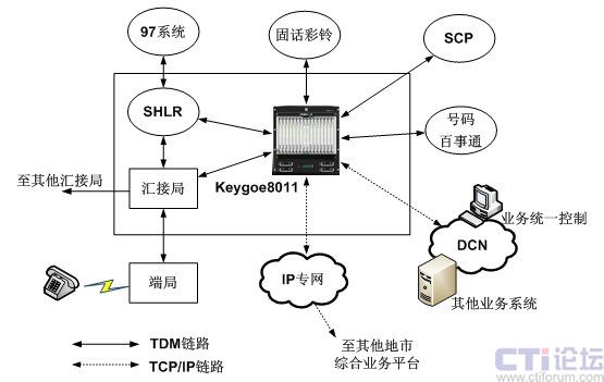 東進Keygoe系列多媒體交換機通過高密度7號信令鏈路支持、大容量的時隙交換、多網(wǎng)絡(luò)接口和語音處理完成不同業(yè)務(wù)系統(tǒng)的7號信令的接續(xù)和解析、話音交換和協(xié)議轉(zhuǎn)換。對于已經(jīng)進行固網(wǎng)智能改造的電信網(wǎng)絡(luò),可以在匯接局將各種業(yè)務(wù)平臺連接至東進Keygoe系列多媒體交換機,并通過東進Keygoe系列多媒體交換機連接至SHLR,實現(xiàn)多業(yè)務(wù)平臺上的多業(yè)務(wù)觸發(fā),同時通過SHLR與97系統(tǒng)以及其他業(yè)務(wù)支撐系統(tǒng)連接起來,實現(xiàn)業(yè)務(wù)的統(tǒng)一批價、鑒權(quán)和計費;對于沒有進行固網(wǎng)智能化改造的電信網(wǎng)絡(luò),可以在匯接局通過東進Keygoe系列多媒體交換機和SSP提供基于TCP/IP層面的業(yè)務(wù)平臺互聯(lián)。