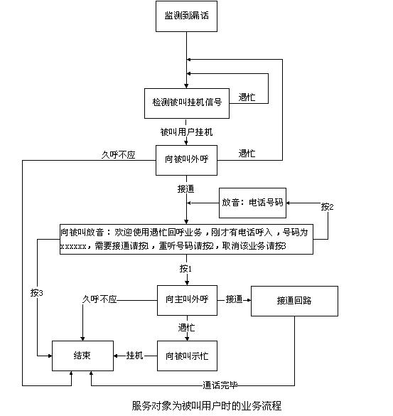 當(dāng)服務(wù)對(duì)象是被叫用戶時(shí),產(chǎn)生遇忙漏話后,東進(jìn)漏話監(jiān)測設(shè)備(DMCS)實(shí)時(shí)檢測被叫用戶的掛機(jī)信號(hào),如果被叫掛機(jī),則先向被叫外呼,呼出接通后,語音提示“歡迎使用遇忙回呼業(yè)務(wù),剛才有電話呼入,號(hào)碼為xxxxxx,需要接通請(qǐng)按1,重聽號(hào)碼請(qǐng)按2,取消該業(yè)務(wù)請(qǐng)按3”,如按1,系統(tǒng)向原主叫外呼(亦稱回呼),回呼成功(ACM)后,建立話音回路,進(jìn)一步接續(xù);如回呼原主叫時(shí)遇忙(SLB、STB等),則回呼失敗,向被叫用戶示忙。