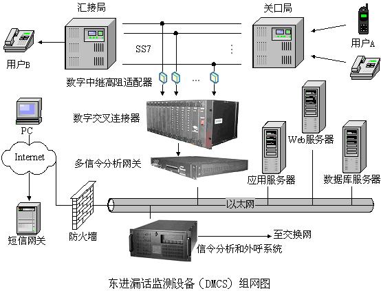 業(yè)務(wù)的組網(wǎng)分為信令網(wǎng)(SS7)和計(jì)算機(jī)網(wǎng)(TCP/IP),兩種異構(gòu)網(wǎng)絡(luò)通過東進(jìn)漏話監(jiān)測設(shè)備(DMCS)中的多信令分析網(wǎng)關(guān)連起來,多信令分析網(wǎng)關(guān)通過數(shù)字中繼高阻適配器和數(shù)字交叉連接器跨接在關(guān)口局和匯接局之間,同時(shí)也接到產(chǎn)生業(yè)務(wù)邏輯的計(jì)算機(jī)網(wǎng)。當(dāng)有外網(wǎng)的用戶A(也可以是本地網(wǎng)內(nèi)的用戶)呼叫網(wǎng)內(nèi)的注冊(cè)用戶B遇忙時(shí),東進(jìn)漏話監(jiān)測設(shè)備(DMCS)中的多信令分析網(wǎng)關(guān)檢測到遇忙信號(hào),就開始實(shí)時(shí)監(jiān)測信令網(wǎng)中用戶B的掛機(jī)信號(hào),當(dāng)監(jiān)測到用戶B的掛機(jī)信號(hào)后,就將掛機(jī)信號(hào)轉(zhuǎn)換為基于TCP/IP協(xié)議的包信號(hào),交給計(jì)算機(jī)網(wǎng)上的信令分析和外呼系統(tǒng)進(jìn)行信令分析,外呼系統(tǒng)根據(jù)信令,在業(yè)務(wù)邏輯的控制下,通過交換網(wǎng)外呼用戶A或B,完成業(yè)務(wù)動(dòng)作。