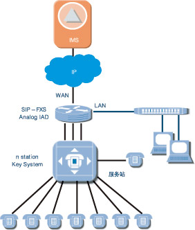 適用于支持模擬線的小交換機(jī),經(jīng)SIPIAD設(shè)備將模擬線路轉(zhuǎn)換為基于IP的SIP信令流和媒體流,接入IMS系統(tǒng)。經(jīng)愛立信測試認(rèn)證過的IAD產(chǎn)品有Mediatrix、Audiocodes、Linksys等。