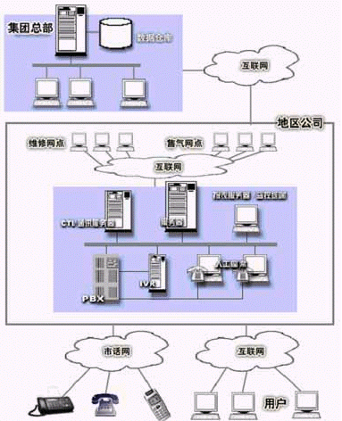 各地區(qū)系統(tǒng)通過(guò)互聯(lián)網(wǎng)和下屬維修網(wǎng)點(diǎn)、銷(xiāo)售網(wǎng)點(diǎn)相連,構(gòu)成一個(gè)地區(qū)性服務(wù)網(wǎng)絡(luò)。各地區(qū)系統(tǒng)通過(guò)互聯(lián)網(wǎng)和集團(tuán)總部連接,構(gòu)成信息收集網(wǎng)絡(luò)。前者支持業(yè)務(wù)服務(wù),后者支持管理決策,共同構(gòu)成綜合公用事業(yè)服務(wù)平臺(tái)。