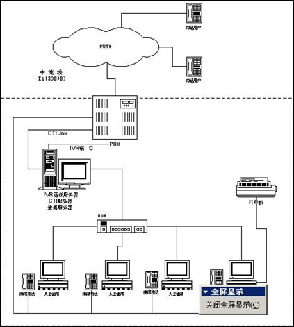 使用Siemens Hicom318交換機(jī),此交換機(jī)接入ISDN中繼線,設(shè)置人工座席分機(jī)及普通分機(jī),為CTI、IVR語(yǔ)音服務(wù)器提供4路IVR端口和CTI LINK控制電纜。
