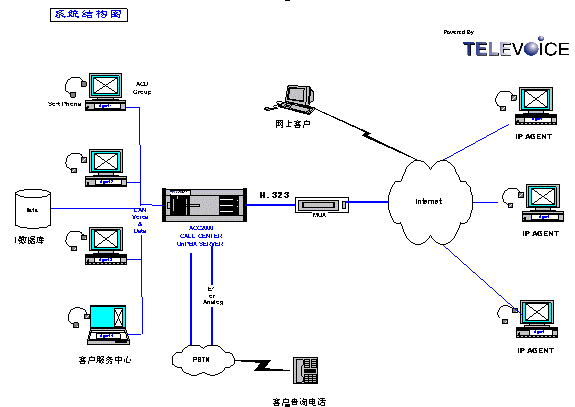 ACC2000通過H.323協議連接Internet,遠程人員在任何位置(使用配備聲卡和耳麥的PC)只要登錄Internet即可實現遠程座席功能.