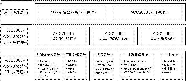 ACC2000 Workshop將基于CTI技術(shù)、功能相對(duì)獨(dú)立的CTI執(zhí)行系統(tǒng)從個(gè)性化的CRM解決方案中分離出來,并通過ACC2000 Workshop的CRM中間層將其功能開放給CRM應(yīng)用程序,從而構(gòu)建了一個(gè)完全開放的呼叫中心開發(fā)平臺(tái),這是ACC2000相對(duì)于其他呼叫中心解決方案最具優(yōu)勢(shì)的特點(diǎn)之一。