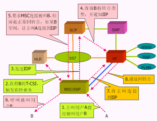 3. 智能網(wǎng)方式使用移動智能網(wǎng)中的信令控制節(jié)點(diǎn)(SCP)實(shí)現(xiàn)智能業(yè)務(wù)的業(yè)務(wù)邏輯,新增的智能外設(shè)用于為用戶提供回鈴音和用戶管理功能。 個性化回鈴音業(yè)務(wù)是基于智能網(wǎng)系統(tǒng)的一個新業(yè)務(wù),在智能網(wǎng)中增加新的業(yè)務(wù)控制點(diǎn)(SCP)和獨(dú)立智能外設(shè)(IIP)。為此只需要為此業(yè)務(wù)加入基于Intel平臺的SCP和IP即可,前者是智能網(wǎng)體系中的業(yè)務(wù)控制設(shè)備,用于實(shí)現(xiàn)智能業(yè)務(wù)的業(yè)務(wù)邏輯,使用的是Intel高性能的c-PCI平臺,支持高可靠性的冗余備份,提供業(yè)務(wù)呼叫控制和業(yè)務(wù)數(shù)據(jù)維護(hù)功能;后者是智能網(wǎng)獨(dú)立外設(shè),使用的是Inetl Dialogic的相關(guān)語音板卡,用于為個性化回鈴音用戶提供語音(回鈴音)、以及業(yè)務(wù)管理等功能。優(yōu)點(diǎn)是無須改動現(xiàn)網(wǎng)上MSC/SSP 的軟件,通過采用SCP 查詢被叫用戶狀態(tài)的方式,只有當(dāng)被叫用戶處于空閑的情況下,才使用IIP 進(jìn)行處理,可以減少系統(tǒng)負(fù)荷,降低SSP 與IIP 之間話路的占用。缺點(diǎn)是需要MSC支持智能網(wǎng)業(yè)務(wù)。