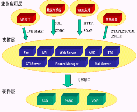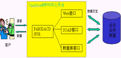 SQL Server,MySQL等多種數據庫;通過HTTP調用第三方WEB程序,通過SOAP協議調用Web Server上的服務,從而利用外部應用進一步加強IVR的功能;用戶只需做一些簡單配置就可以實現電話訪問數據庫、WEB和業(yè)務系統。如圖所示: