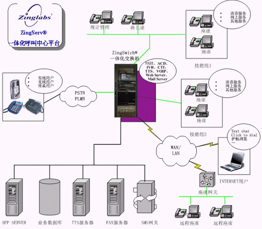 ZingServ®平臺的WEB呼叫/Chat 功能主要面向Internet用戶,用戶可通過Modem撥號、DDN專線、ISDN撥號、局域網、ADSL、Cable