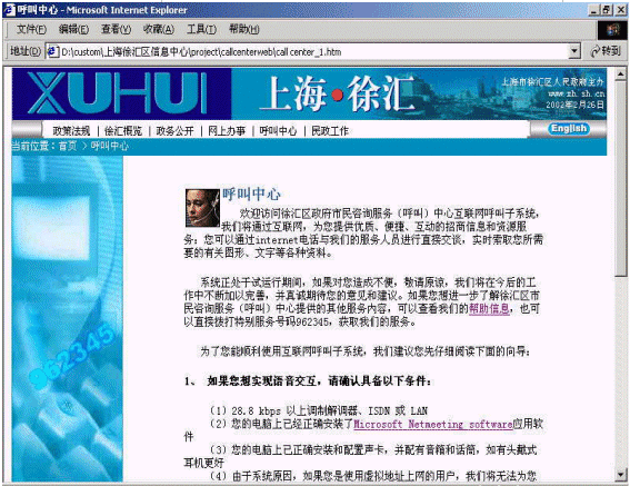 上海市徐匯區(qū)市民咨詢(呼叫)中心的第一期工程包括語音自動應答IVR、按需傳真Fax on Demand、語音郵件Voice Mail、網(wǎng)頁互動Web Interaction、座席屏幕彈出Agent Screen Pop、報表以及語音記錄等功能。該中心具有以下特點,很好地滿足了徐匯區(qū)政府的要求。