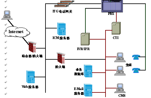 AllCom ICC呼叫中心采用開放的和可擴展的體系結(jié)構(gòu),通過高度靈活的系統(tǒng)平臺,為客戶提供Internet多媒體的接入方式。圖中右側(cè)是傳統(tǒng)呼叫中心部分,左側(cè)為Internet呼叫中心所特有的,其中關(guān)鍵部件為Internet呼叫管理(ICM)和IP電話網(wǎng)關(guān)(ITG)。