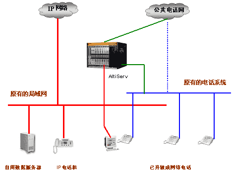 您可以直接將奧迪堅(jiān)高度整合通訊服務(wù)器Altiserv接入局域網(wǎng)絡(luò),將直線電話接入Altiserv模擬外線端(需要的話,也可向電話公司申請(qǐng)中繼線接入)。