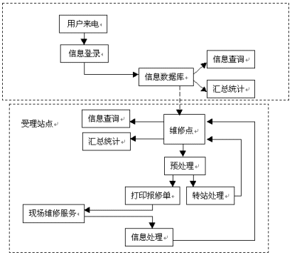 維修點(diǎn)對(duì)用戶的報(bào)修情況進(jìn)行預(yù)處理之后,根據(jù)用戶所在的區(qū)域,分配至最近距離的維修站,將用戶與其報(bào)修信息即時(shí)轉(zhuǎn)移,這也就是圖中所顯示的"轉(zhuǎn)站處理"。之后,維修站將直接打印出報(bào)修單,加快服務(wù)實(shí)施的效率、減少人工出錯(cuò)的比例,有專業(yè)人員及時(shí)上門服務(wù)檢修。