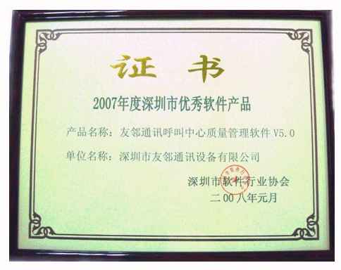 2008年3月14日,深圳市友鄰通訊設備有限公司(以下簡稱“友鄰通訊”)宣布,公司主打軟件產(chǎn)品“友鄰通訊呼叫中心質量管理軟件V5.0”(即 AP Suite 呼叫中心質量管理系統(tǒng)V5.0)榮獲深圳市軟件行業(yè)協(xié)會“2007年度深圳市優(yōu)秀軟件產(chǎn)品”榮譽稱號。
