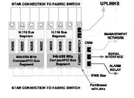 如果我們采用基于CompactPCI標(biāo)準(zhǔn)的刀片服務(wù)器系統(tǒng)來實現(xiàn),系統(tǒng)可能就是完全另外一種樣子(如圖1),這樣的實現(xiàn),首先系統(tǒng)體積小,只要一個刀片服務(wù)器機箱;第二,系統(tǒng)基于標(biāo)準(zhǔn)的體系架構(gòu),開發(fā)和維護(hù)容易,成本低廉;第三,系統(tǒng)非常好地集成了語音通信和IP通信,易于部署增值電信業(yè)務(wù);第四,系統(tǒng)具有較好的可擴展性,因為背板提供了豐富的帶寬資源,同時單位空間內(nèi)豐富的插槽,可以安裝更多的服務(wù)器刀片,提供了充足的計算資源;第五,系統(tǒng)還可以利用各種高可靠性和高可管理性的特點。
