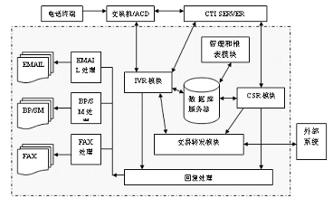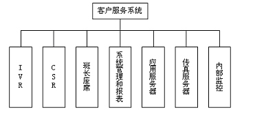 客戶服務中心系統(tǒng)由智能排隊機(含接入服務器)、核心服務器CTI、交互式語音應答系統(tǒng)IVR、語音傳真服務器、業(yè)務服務器、工作流服務器、數(shù)據(jù)庫服務器、Internet/Intranet服務器、人工座席、尋呼機接口、手機短消息接口等組成。