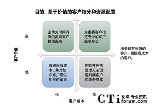 現(xiàn)實(shí)情況是,許多采取該策略的公司都僅將基于價(jià)值的客戶細(xì)分應(yīng)用于高價(jià)值、高成本的客戶,而不是應(yīng)用于已有客戶的絕大部分。這是一種不可持續(xù)的商業(yè)行為。然而,許多公司之所以這樣做,是因?yàn)楣驹谒械目蛻艏?xì)分領(lǐng)域,無(wú)視價(jià)值高低,不加區(qū)分的投入成本和服務(wù),會(huì)存在風(fēng)險(xiǎn),即讓服務(wù)更多的投入到價(jià)值不高,卻又經(jīng)常呼入的客戶上,從而忽視了一些更有